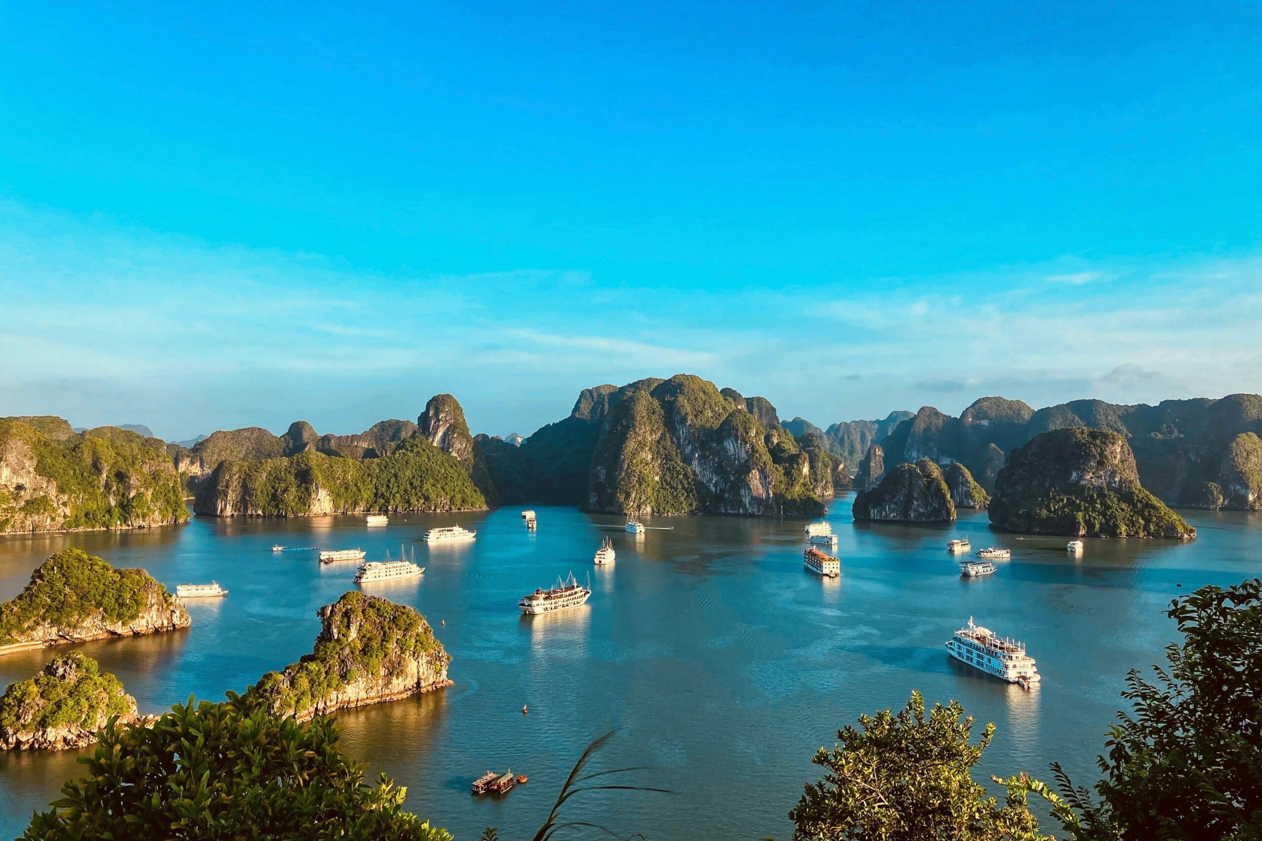 Halong Bay staat bekend om zijn duizenden kalksteenrotsen die oprijzen uit het water. De beste manier om dit UNESCO-gebied te ontdekken is per cruise, waarbij je vaart langs de rotsformaties, grotten bezoekt en kajakt in stille baaitjes.